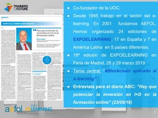 El documento presenta información sobre las últimas novedades en e-learning en España y a nivel mundial, incluyendo datos sobre el crecimiento del sector, tendencias como blockchain y realidad aumentada, y consejos para docentes. José Lozano Galera, CEO de AEFOL, destaca el potencial del e-learning y su futuro prometedor con la inteligencia artificial.