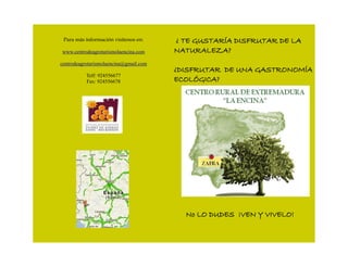 El Centro Rural de Extremadura La Encina es un centro de agroturismo ecológico que ofrece talleres sobre la cría de ganado, alfarería, jabones y gastronomía ecológica, así como rutas de senderismo, pesca y catas, para dar a conocer las costumbres y forma de vida tradicional de la zona en un marco natural incomparable.