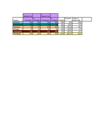 Este documento presenta los gastos de un estudiante durante dos semestres divididos en cuatro trimestres. Muestra los gastos en vivienda, alimentación, vestuario, energía y transportes, así como los totales y promedios para cada categoría y trimestre. El mayor gasto fue en transportes con un 27.7% del total, seguido de vestuario con un 20.7%.