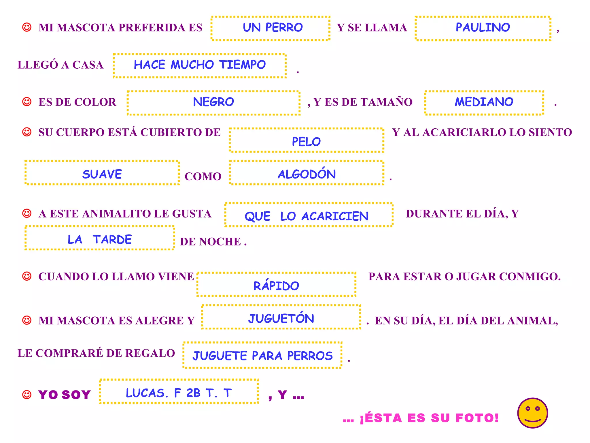 Mi mascota preferida es un perro llamado Paulino. Es de color negro y tamaño mediano, con pelo suave. A Paulino le gusta jugar durante el día y dormir de noche. Es un perro alegre y juguetón que viene cuando lo llamo. En su día le compraré un nuevo juguete.