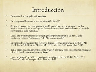 El documento presenta una introducción al Evangelio de Lucas. Explica que fue escrito probablemente entre los años 60 y 90 d.C. por Lucas, un médico gentil que acompañó a Pablo en sus viajes. Detalla que Lucas no fue testigo de los hechos de Jesús y que dirigió su evangelio a Teófilo y a otros lectores gentiles. Resume los temas principales tratados en el evangelio como la unidad de la iglesia, el papel de la mujer, y la demostración histórica de Jesús como el Hijo del Hombre.