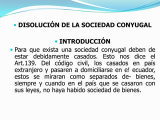 Este documento trata sobre la disolución de la sociedad conyugal según la ley ecuatoriana y la comparación con la ley argentina. Explica que existen causales para la disolución como la terminación del matrimonio, sentencia judicial o nulidad del matrimonio. También describe que la disolución puede darse de mutuo acuerdo ante un notario o por demanda de uno de los cónyuges ante un juez, y que tanto el cónyuge como el notario pueden iniciar el proceso de disolución.
