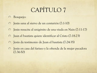 Este capítulo presenta tres historias principales: 1) Jesús sana al siervo de un centurión romano, admirado por su fe; 2) Jesús resucita al hijo de una viuda, conmoviéndose por su situación; 3) Durante una cena, una mujer pecadora unge a Jesús con perfume costoso como acto de arrepentimiento, recibiendo su perdón públicamente. También se discute el ministerio de Juan el Bautista y su relación con Jesús.