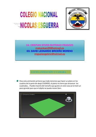 Este documento proporciona instrucciones para crear una animación con luces y cámara en movimiento. Explica cómo crear un plano con tres partes pero sin tapar todo, luego animar a un hombre para que camine de un lado a otro, agregar luces fijas hacia la figura, y finalmente añadir una cámara en movimiento para ver mejor al hombre.