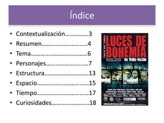 El resumen describe la trama de la obra Luces de Bohemia de Ramón María del Valle-Inclán en 3 oraciones: Max Estrella, un escritor bohemio ciego y pobre, pasa el día emborrachándose y termina en la cárcel; al salir visita a un antiguo amigo ministro para pedir ayuda pero solo recibe una subvención; por la noche tiene una visión de la muerte y a la mañana siguiente es encontrado muerto.