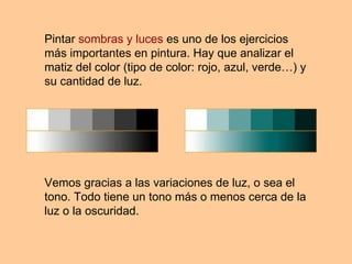 Este documento explica la importancia de pintar sombras y luces para representar el volumen y la forma de los objetos. Describe cómo la luz y la sombra crean tonos y permiten distinguir entre superficies planas y curvas. Usa el ejemplo de una bola iluminada para mostrar las diferentes zonas de luz (brillo), medio tono y sombra (propia, reflejada y arrojada). Finalmente, presenta algunas técnicas para sombrear como hacer líneas, círculos o suavizar el grafito.