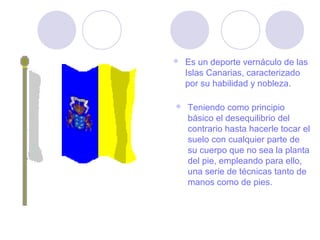 La lucha canaria es un deporte tradicional de las Islas Canarias enfocado en el desequilibrio del oponente sin permitir llaves ni luchas en el suelo. Se practica en terreros específicos con técnicas reglamentadas y un vestuario adecuado, siendo promovida por federaciones regionales e insulares. Este deporte ha ganado popularidad y cuenta con una rica historia de luchadores destacados.