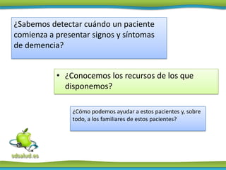 El documento proporciona información sobre la detección de la demencia, sus signos y síntomas iniciales, medios y avanzados. También ofrece consejos para cuidar a pacientes con demencia como fomentar su autonomía, mejorar la comunicación, asegurar su seguridad, nutrición e higiene personal. Además, brinda recursos como asociaciones de familiares de personas con Alzheimer.