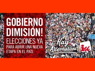 El documento aborda la creciente desigualdad y empobrecimiento en la sociedad, enfatizando la necesidad de una nueva alternativa política frente a las políticas neoliberales. Se destaca el papel crucial de Izquierda Unida en constituir un frente amplio que represente a la mayoría social y desafíe el sistema bipartidista. Además, se señala la importancia de movilizar a la ciudadanía y promover demandas sociales para enfrentar la corrupción y restaurar la democracia en España.