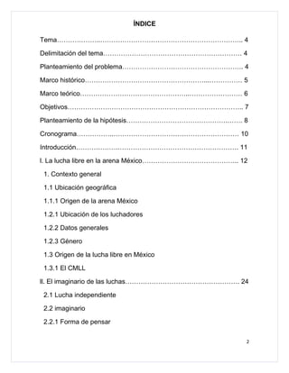 Este documento presenta un proyecto de investigación sobre la lucha libre en México realizado por estudiantes de la Facultad de Estudios Superiores Aragón de la UNAM. El documento contiene la delimitación del tema, el planteamiento del problema, el marco histórico y teórico, los objetivos y la hipótesis del proyecto. Asimismo, incluye un cronograma y la introducción del trabajo, el cual analizará aspectos como el origen y desarrollo de la lucha libre en México, el imaginario