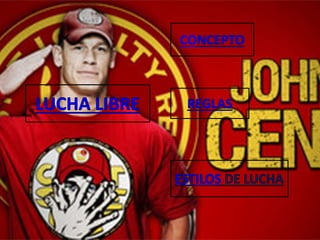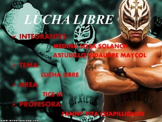 Este documento presenta información sobre una clase de lucha libre. Incluye los nombres de los integrantes del equipo, el tema de lucha libre, el área y la profesora. Explica brevemente los orígenes de la lucha libre y describe algunas de sus reglas principales como pinfall, sumisión y cuenta fuera. También resume dos estilos principales de lucha libre, la mexicana y la japonesa, destacando sus características distintivas.