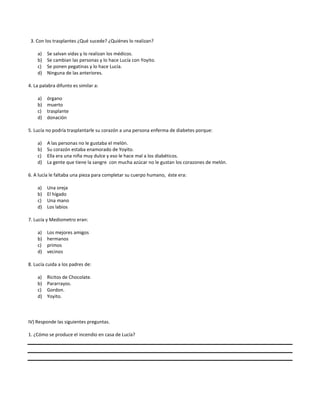 Este documento presenta una prueba de lectura sobre el libro "Lucía Moñitos, corazón de melón" dirigida a estudiantes de tercer grado. La prueba contiene preguntas múltiple choice y de respuesta corta para evaluar la comprensión lectora del estudiante sobre detalles del libro como el nombre de los personajes y la trama central que involucra a Lucía armando un cuerpo humano de pegatinas y aprendiendo sobre la donación de órganos.