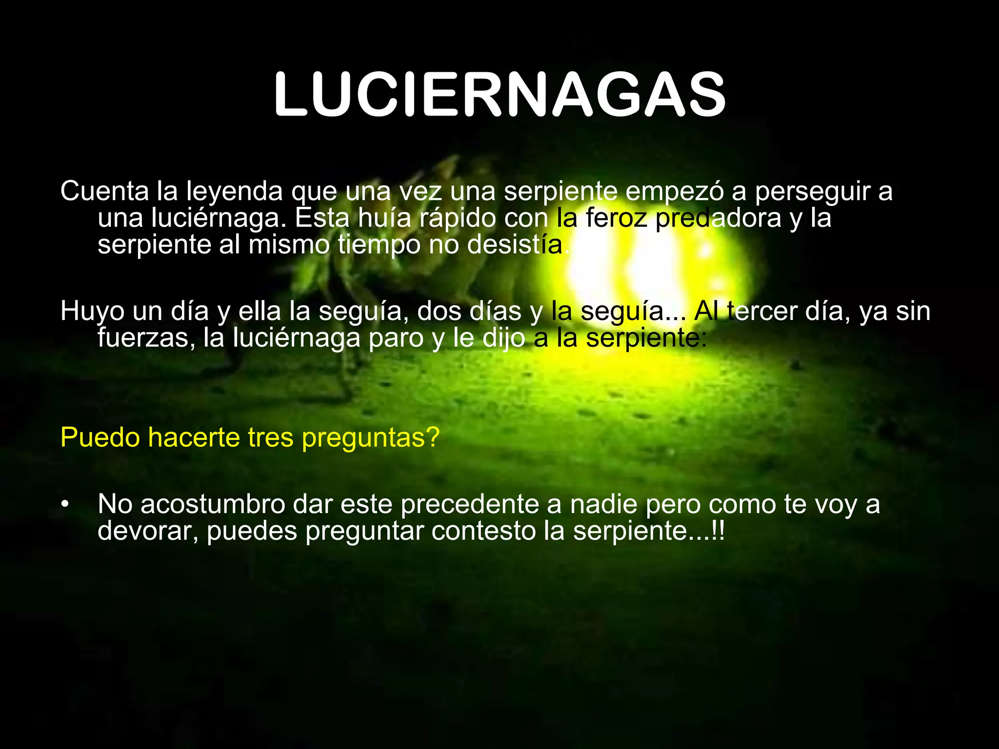 Una luciérnaga es perseguida por una serpiente durante tres días. Agotada, la luciérnaga pregunta a la serpiente tres preguntas: si pertenece a su cadena alimenticia, si le hizo algún daño, y por qué quiere acabar con ella. La serpiente responde que no a las primeras dos preguntas y que la persigue porque no soporta verla brillar. La moraleja es que a veces persiguen a los que brillan no por hacer daño, sino por envidia de su luz.