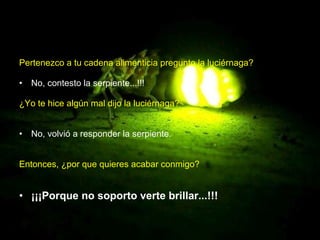La historia cuenta de una luciérnaga que es perseguida por una serpiente durante tres días. Antes de morir, la luciérnaga le pregunta a la serpiente por qué la persigue si no es su presa ni le ha hecho daño. La serpiente responde que la persigue porque no soporta verla brillar. La moraleja es que a veces otros nos atacan no por algo que hayamos hecho, sino porque les molesta nuestro brillo o éxito.