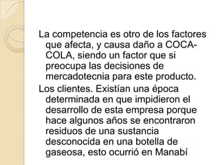Este documento proporciona información sobre Coca-Cola y su presencia en Ecuador. Detalla la historia de la compañía, sus ingredientes, fabricación en Ecuador, y su llegada y expansión en el país a través de la fusión de varios grupos embotelladores en Ecuador Bottling Company. También analiza aspectos del marketing de Coca-Cola como segmentación del mercado, competidores, precios, canales de distribución y promoción.