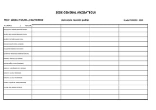 Este documento es una lista de asistencia de una reunión de padres para el grado primero en el año 2015. Contiene los nombres de 20 estudiantes y si asistieron o no a la reunión.