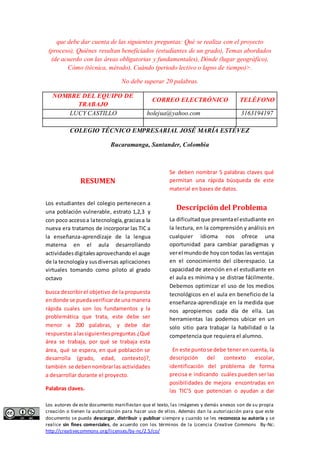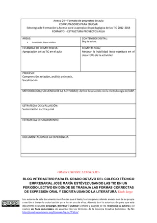 Este proyecto busca mejorar la expresión oral y escrita de los estudiantes del grado octavo de un colegio en Colombia a través del uso de un blog como herramienta pedagógica. El proyecto se enfoca en desarrollar hábitos de lectura y reconocer la importancia del buen uso del lenguaje para mejorar la comunicación entre los estudiantes.