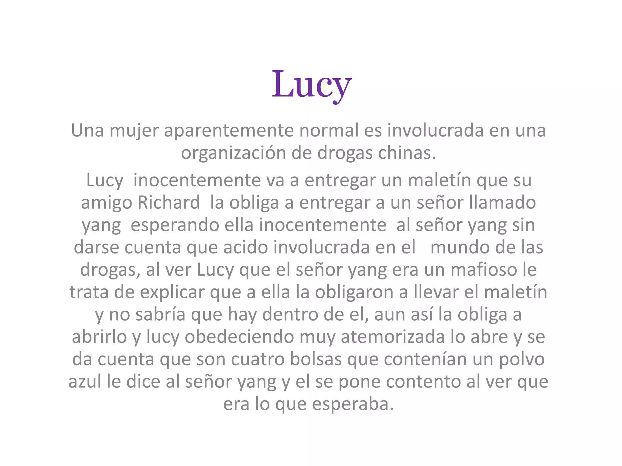 Lucy, una mujer inocente, es obligada a entregar un maletín que contiene una droga azul llamada CPH4. Después de entregarlo, es golpeada y le insertan la droga en el vientre para transportarla a Europa. Sin embargo, la droga se libera en su cuerpo y le otorga habilidades sobrehumanas como fuerza, velocidad e inteligencia intensificada. Lucy viaja a París para recuperar más drogas y desarrolla aún más habilidades. Finalmente, decide compartir su conocimiento convirtiéndose