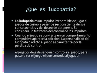 La ludopatía es un trastorno del control de impulsos caracterizado por un irresistible deseo de apostar a pesar de las consecuencias negativas. Los síntomas incluyen preocupación frecuente por el juego, necesidad de apuestas mayores para sentir la misma emoción, irritabilidad al intentar dejar de jugar, y mentiras para ocultar las cantidades apostadas. Las personas con mayor riesgo son aquellas con antecedentes familiares de problemas de juego, trastornos del estado de ánimo, o que empezaron a jugar a