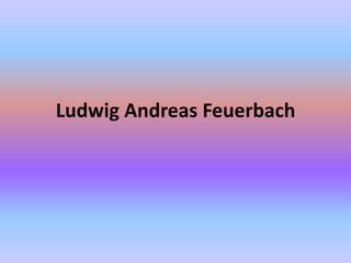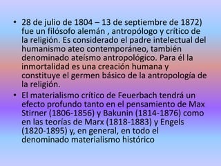Ludwig Feuerbach fue un filósofo alemán que criticó la religión y consideró que Dios es una creación humana que refleja los deseos y cualidades del hombre. Su crítica de la religión influyó en pensadores como Marx y Engels, aunque ellos más tarde se distanciaron de su materialismo. Feuerbach argumentó que el hombre proyecta sus mejores atributos en la idea de Dios, pero que esto lleva a una enajenación donde el hombre se ve dominado por su propia creación.