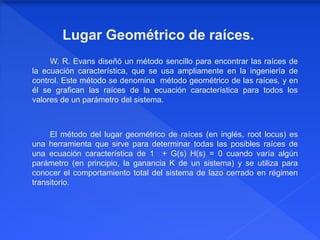 El documento describe el método del lugar geométrico de raíces, el cual grafica las raíces de la ecuación característica de un sistema de control para diferentes valores de un parámetro. Explica las reglas para construir el lugar geométrico, incluyendo dibujar los polos y ceros del sistema abierto, determinar la existencia del lugar geométrico en el eje real, y trazar las asíntotas y puntos de ruptura. El propósito es analizar el comportamiento del sistema de lazo cerrado.
