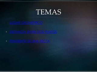 El documento presenta una exposición sobre conceptos matemáticos de geometría realizada por 4 estudiantes. Cubre temas como lugar geométrico, distancia entre puntos y pendiente de una recta. Explica que un lugar geométrico es un conjunto de puntos con una característica común y muestra fórmulas para calcular distancia y pendiente. Finalmente pide al público que consulte valores de pendiente y resuelva ejercicios de distancia entre puntos.