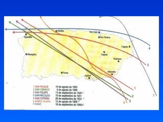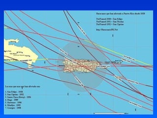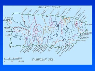 Puerto Rico tiene un clima tropical influenciado por los vientos alisios. Recibe mucha precipitación, especialmente en la zona noreste. El documento describe los fenómenos atmosféricos como vaguadas, ciclones, ondas tropicales y huracanes que afectan la isla. También explica la formación y clasificación de huracanes según su velocidad de vientos. Finalmente, resume los cuatro sistemas fluviales principales de la isla y algunos de sus ríos más importantes.