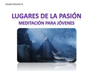 Este documento presenta resúmenes breves de varios lugares relacionados con la Pasión de Jesús mencionados en los evangelios, incluyendo el Cenáculo, Getsemaní, la casa de Caifás, el pretorio de Pilatos, el palacio de Herodes, el Gólgota, y el sepulcro. Cada lugar se describe en uno o dos párrafos resaltando su significado espiritual y cómo puede relacionarse con experiencias humanas actuales. Al final de cada sección, la autora incluye una oración pidiendo guía divina.