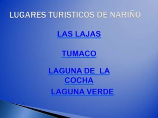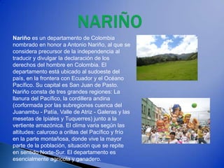 Nariño es un departamento al sudoeste de Colombia nombrado en honor a Antonio Nariño. Su capital es San Juan de Pasto y consta de tres grandes regiones: la llanura del Pacífico, la cordillera andina y la vertiente amazónica. El clima y la economía varían según la altitud, siendo agrícola y ganadera principalmente en las zonas montañosas.