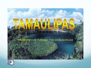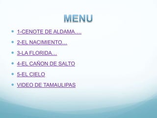 Este documento presenta cinco destinos turísticos en Tamaulipas, México: 1) El Cenote de Aldama, que contiene cuatro pozas de aguas sulfurosas de diferentes tamaños y colores; 2) El Nacimiento, un manantial con actividades acuáticas y una cueva profunda; 3) La Florida, un parador con avistamiento de aves y mariposas; 4) El Cañón de Salto, conocido por sus cascadas azules; 5) El Cielo, un área natural con formaciones geológicas únic