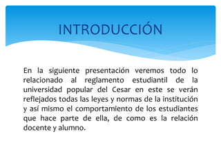 Este documento presenta el reglamento estudiantil de la Universidad Popular del Cesar, Colombia. Define los derechos, deberes y normas que deben seguir los estudiantes. Explica los procedimientos para casos de fraude académico y agresión física. También cubre situaciones como exenciones de matrícula por buen rendimiento y publicación de trabajos estudiantiles. El objetivo es que los estudiantes conozcan y apliquen el reglamento para mantener el orden en la institución.