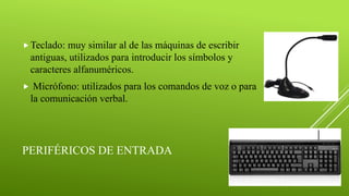 Este documento describe los principales periféricos de entrada, salida y almacenamiento de un computador personal. Entre los periféricos de entrada se encuentran el teclado, mouse, micrófono y cámara web. Los periféricos de salida incluyen el monitor, impresora, altavoces y auriculares. Los métodos de almacenamiento discutidos son los discos duros, unidades flash, discos compactos, DVDs y discos Blu-ray.