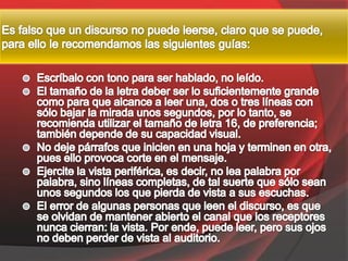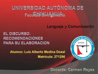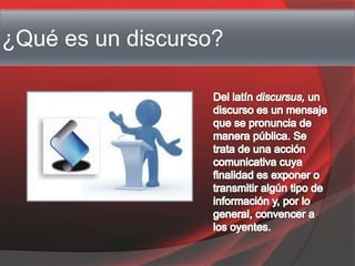Este documento habla sobre los elementos básicos de un discurso, incluyendo la introducción, el contenido, la conclusión y diferentes tipos de discursos como el didáctico, el persuasivo y el de información. También proporciona sugerencias para el manejo efectivo del discurso como enfocarse en el objetivo, construir empatía con la audiencia y hablar de manera natural.