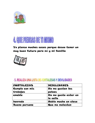 El documento presenta los pensamientos y planes de futuro de Luis Alejandro Paniagua Lopez. Él tiene una alta autoestima y sueña con tener un buen futuro para él y su familia como ingeniero de sistemas profesional. Para lograr sus metas, Luis planea estudiar mucho durante el próximo año, trabajar duro durante los próximos seis años y siempre esforzarse por ser un buen estudiante, el mejor en su colegio, un hijo obediente y de ayuda para sus padres.