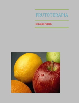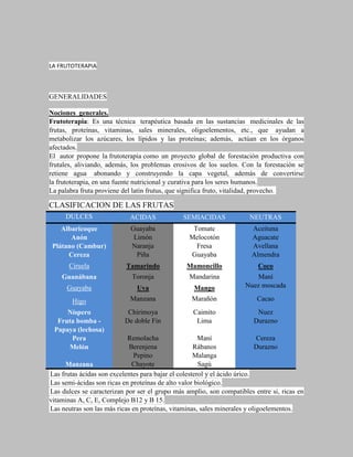 Este documento habla sobre la frutoterapia, que usa sustancias de frutas para tratar problemas de salud. Explica las clasificaciones de frutas como dulces, ácidas, semiácidas y neutras. Da recomendaciones sobre el consumo de frutas como comerlas frescas y solas. Advierte sobre mezclas de frutas que pueden ser perjudiciales y causa fermentación tóxica. También describe vitaminas y minerales presentes en diferentes frutas y sus beneficios para la salud.