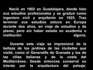 Luis Barragán, nacido en 1902 en Guadalajara, fue un ingeniero civil y arquitecto que se destacó por su enfoque en la belleza y la intimidad en la arquitectura. Su obra, influenciada por sus viajes a Europa, busca remediar la ausencia de absolutos en la condición posmoderna, y ha sido reconocida en diversas publicaciones. Algunas de sus obras notables incluyen la Casa en Avenida de las Fuentes y la reconstrucción del Convento de las Capuchinas.