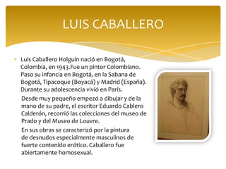 Este documento resume la vida y obra del pintor colombiano Luis Caballero. Nació en Bogotá en 1943 y pasó su infancia en varias ciudades de Colombia y España. Se caracterizó por pintar desnudos masculinos con fuerte contenido erótico, siendo abiertamente homosexual. Sus obras buscaban expresar el deseo, erotismo y belleza del cuerpo humano de una manera sensual.