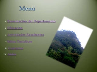 El documento describe el departamento de Cordillera en Paraguay. Señala que la capital es Caacupé, fundada en 1770, y tenía una población de 273,606 habitantes en 2009. Limita con los departamentos de San Pedro, Paraguarí, Central y Caaguazú, y el río Paraguay. El departamento comprende una superficie de 4,948 km2 y contiene bellezas naturales como serranías, arroyos, y el lago Ypacaraí. También menciona varios sitios turísticos en Cordillera.