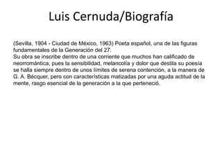 Luis Cernuda fue un poeta español de la Generación del 27. Su poesía se caracterizó por la melancolía, el dolor y la soledad del ser humano. Aunque su estilo se asemejaba al romanticismo español, Cernuda buscó un tono más sencillo y coloquial para expresar su insatisfacción con la sociedad y las normas morales de su época. Publicó varios libros de poesía a lo largo de su vida que exploraron temas como el amor, el exilio y la identidad.