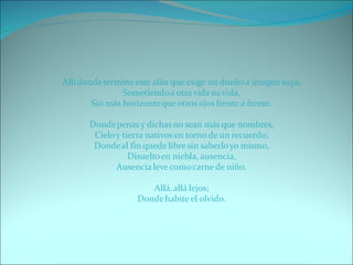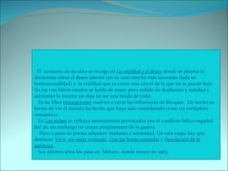 Luis Cernuda fue un poeta español nacido en 1902 en Sevilla. Publicó su primer libro Perfil del aire en 1927, influenciado por la literatura del Siglo de Oro y la poesía de Bécquer. Más tarde se interesó en el surrealismo, el cual influyó en sus libros Un río, un amor, Los placeres prohibidos y Donde habite el olvido. A lo largo de su obra exploró la dicotomía entre el deseo y la realidad, especialmente en relación a su homosexualidad. Pasó sus últimos años