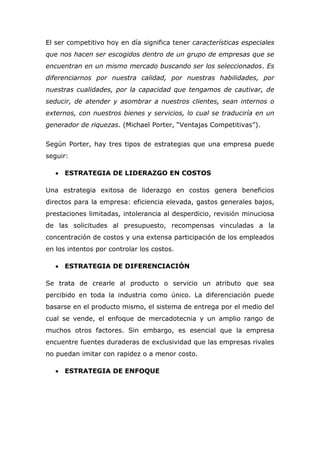 Este documento resume el concepto de ventaja competitiva según Michael Porter. Explica que una ventaja competitiva permite a una empresa desempeñarse por encima del promedio de su industria en áreas como costos, productos, servicio al cliente u otros factores. Según Porter, existen tres estrategias generales para lograr ventaja competitiva: liderazgo en costos, diferenciación y enfoque en un segmento de mercado específico.