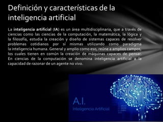 La inteligencia artificial es un área multidisciplinaria que estudia cómo crear sistemas capaces de resolver problemas por sí mismos utilizando la inteligencia humana como paradigma. Algunas ramas principales de la IA incluyen sistemas expertos, aprendizaje automático, robótica, procesamiento de lenguaje natural y visión por computadora.