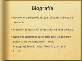 Luis Llorens Torres nació en 1876 en Puerto Rico y murió en 1944. Recibió educación secundaria en Maricao y estudió leyes, filosofía y letras en España. Se dedicó a la abogacía, poesía y periodismo en Puerto Rico. Fue un luchador por la independencia de Puerto Rico y fundó varias revistas literarias. Su poesía criollista le ganó reconocimiento en la isla.