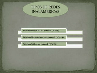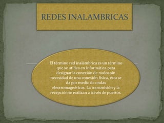 Las redes inalámbricas permiten la conexión de dispositivos a través de ondas electromagnéticas sin necesidad de cables físicos. Existen tres tipos principales de redes inalámbricas: WPAN para áreas personales, WMAN para áreas metropolitanas, y WWAN para áreas amplias. Las tarjetas de red inalámbricas facilitan la conectividad inalámbrica entre dispositivos.