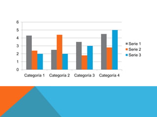 Este gráfico muestra tres series de datos que representan valores numéricos para cuatro categorías diferentes. La Serie 1 tiene los valores más altos para las Categorías 1 y 2, mientras que la Serie 3 tiene los valores más altos para las Categorías 3 y 4.