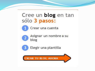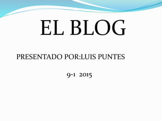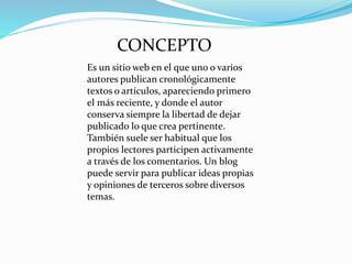 El documento define un blog como un sitio web en el que uno o más autores publican artículos de forma cronológica, donde el autor mantiene la libertad de publicar lo que considere pertinente. Un blog se caracteriza por ser una publicación periódica, admitir comentarios de lectores para crear una comunidad, y permitir una comunicación bilateral entre el autor y los lectores. El primer blog fue creado por Tim Berners-Lee en 1993 como un listado de sitios web con comentarios, y el término "blog" fue acuñado en 1999 para referirse a