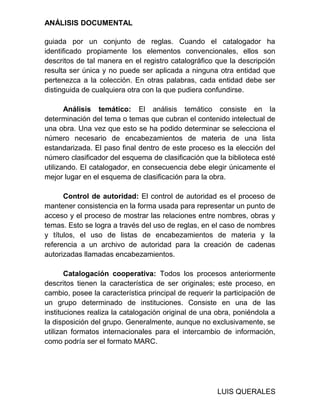 La catalogación es el conjunto de operaciones necesarias para describir completamente un documento y asignarle una signatura, incluyendo la catalogación por materias y selección de puntos de acceso. Existe catalogación descriptiva, de análisis temático, de control de autoridad y cooperativa. La catalogación descriptiva describe aspectos físicos e identifica responsabilidad intelectual, mientras que el análisis temático determina temas y selecciona encabezamientos sujetos a clasificación. El control de autoridad mantiene consistencia en puntos de acceso y