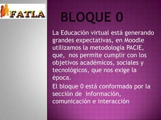 El documento describe la metodología PACIE utilizada en Moodle para cursos en línea. PACIE se enfoca en cumplir objetivos académicos, sociales y tecnológicos. El bloque 0 incluye secciones de información, comunicación e interacción. La sección de información presenta el curso, tutor y evaluación. La sección de comunicación detalla las actividades. La sección de interacción incluye una cafetería virtual, taller y foro para interactuar social y académicamente.