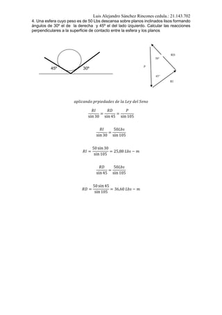 El documento presenta cálculos de tensiones y reacciones en un sistema de cuerdas y planos inclinados, considerando un peso colgante de 35 newtons y un peso de 50 libras sobre superficies inclinadas. También se describen métodos para calcular las coordenadas del centro de gravedad de figuras con dimensiones específicas, corrigiendo errores en la identificación de formas. Finalmente, se expone el procedimiento para determinar las fuerzas en un sistema estático utilizando la Ley del Seno.