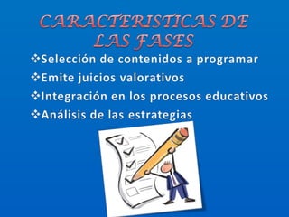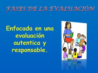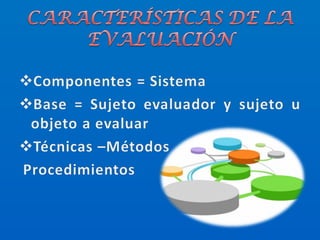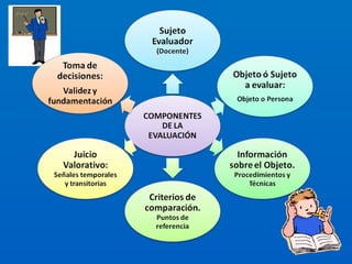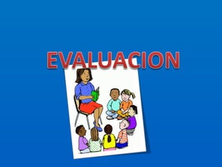El documento habla sobre la importancia de la evaluación educativa y sus diferentes etapas y tipos. Explica que la evaluación implica una metodología para obtener resultados sobre el aprendizaje y debe planificarse. Se da una interacción entre el sujeto (docente) y el objeto (alumno) de la evaluación. Esta puede ser conceptual, procedimental o actitudinal. También hay evaluaciones pre-instruccionales, co-instruccionales y formativas que apoyan el aprendizaje y orientan al estudiante.